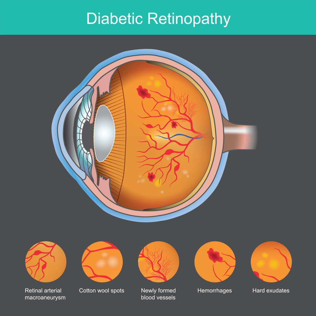 Because diabetes affects blood sugar levels, it can weaken the network of blood vessels within the eyes. For example, diabetic retinopathy is caused when the blood vessels leading to the retina are damaged. The retina absorbs light that is sent as visual information to the brain — when damaged, it can cause vision loss and blindness.