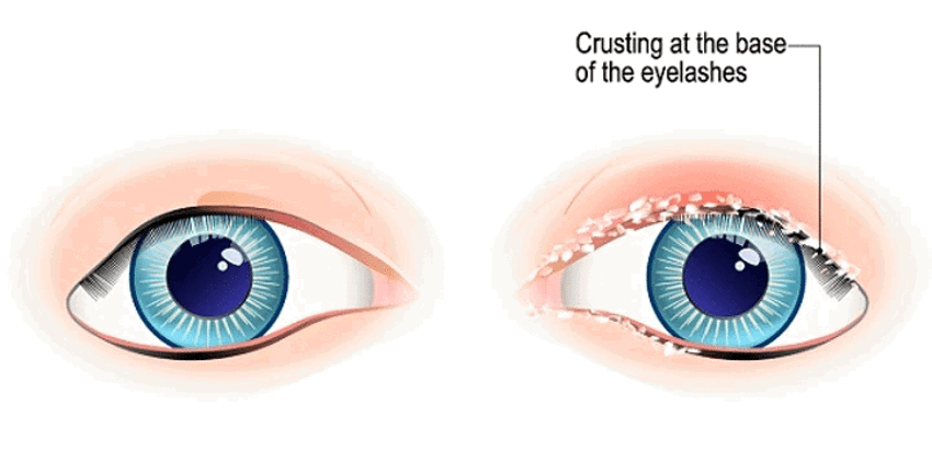 These symptoms include crusty eyelids, a burning sensation, eye or eyelid pain and discomfort, the feeling of a foreign body in your eye, dry eyes, loss of eyelashes, swelling of eyelashes, tearing or stickiness. Treatment for this condition ranges depending on the severity, however, eye drops, ointments, antibiotics and artificial tears are common treatment options.
