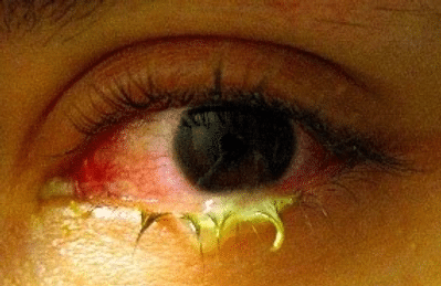 Conjunctivitis usually causes a pink or red-eye with a gritty-feeling. It often starts in one eye, usually spreading to the other. It may also cause your eyelids to stick together in the morning.